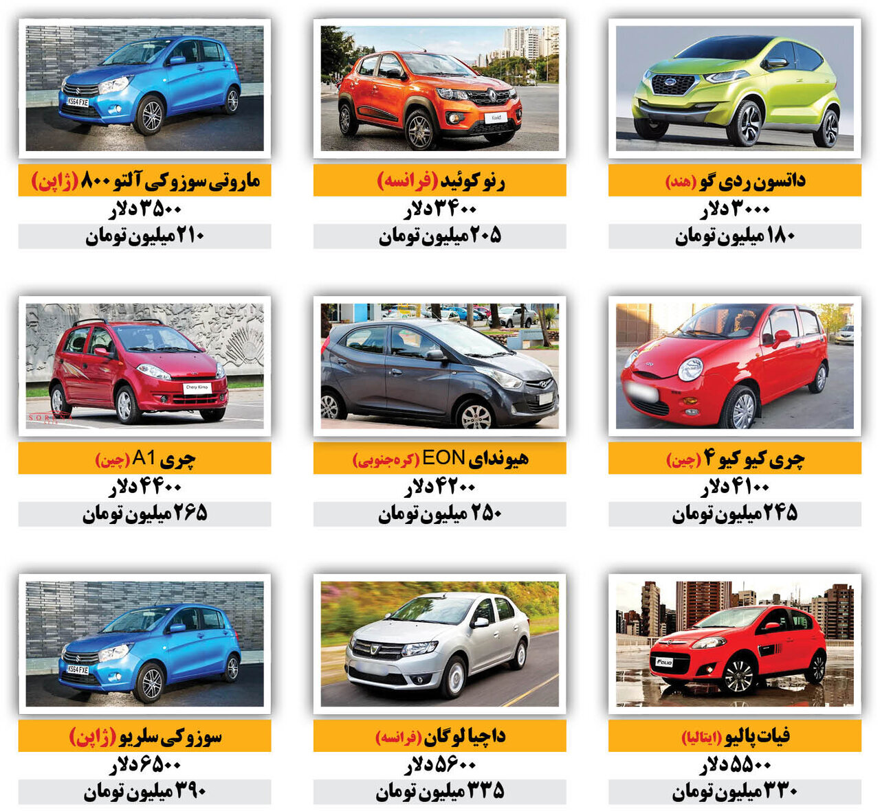در زیر نام برخی خودروهای ارزان قیمت خارجی را می‌بینید. قیمت خودروها با دلار ۶۰هزار تومانی محاسبه شده است. قیمت این خودروها با احتساب تعرفه گمرکی و سود بازرگانی بعد از ورود به ایران حدود ۲برابر می‌شود.