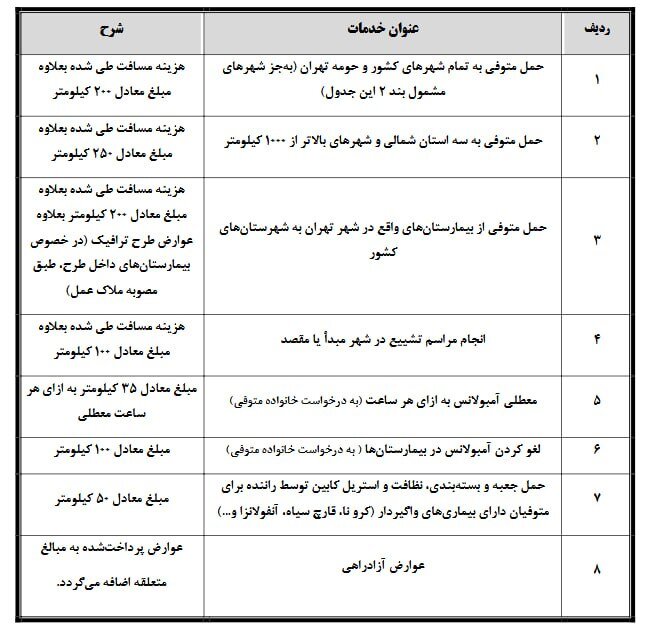 بر اساس این لایحه، هزینه حمل متوفیان در سطح شهر تهران با آمبولانس‌های شهرداری، از ۶ میلیون و ۵۰۰ هزار ریال برای ۱۰ کیلومتر اولیه آغاز شده و برای هر کیلومتر مازاد، ۵۲۰ هزار ریال افزوده می‌شود. همچنین، هزینه حمل متوفی از تهران به پزشکی قانونی ۱۳ میلیون ریال تعیین شده است.